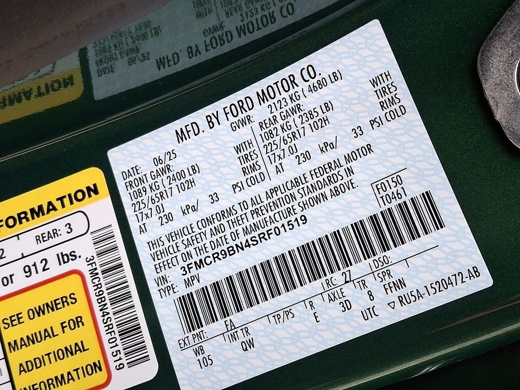 Convenience Package: Premium Wrapped Steering Wheel; Heated 8-Way Power Driver's Seat; Universal Garage Door Opener (UGDO); LED Fog Lamps. Equipment Group 200A: 17" Carbonized Gray-Painted Aluminum Wheel; Cloth with Easy-To-clean Front Bucket Seats; 8-Speed Automatic Transmission; 225/65R17 102H All Season BSW Tires; AM/FM Stereo; 1.5L EcoBoost Engine. Eruption Green Metallic. **Equipment listed is based on original vehicle build and subject to change. Please confirm the accuracy of the included equipment by calling the dealer prior to purchase.**