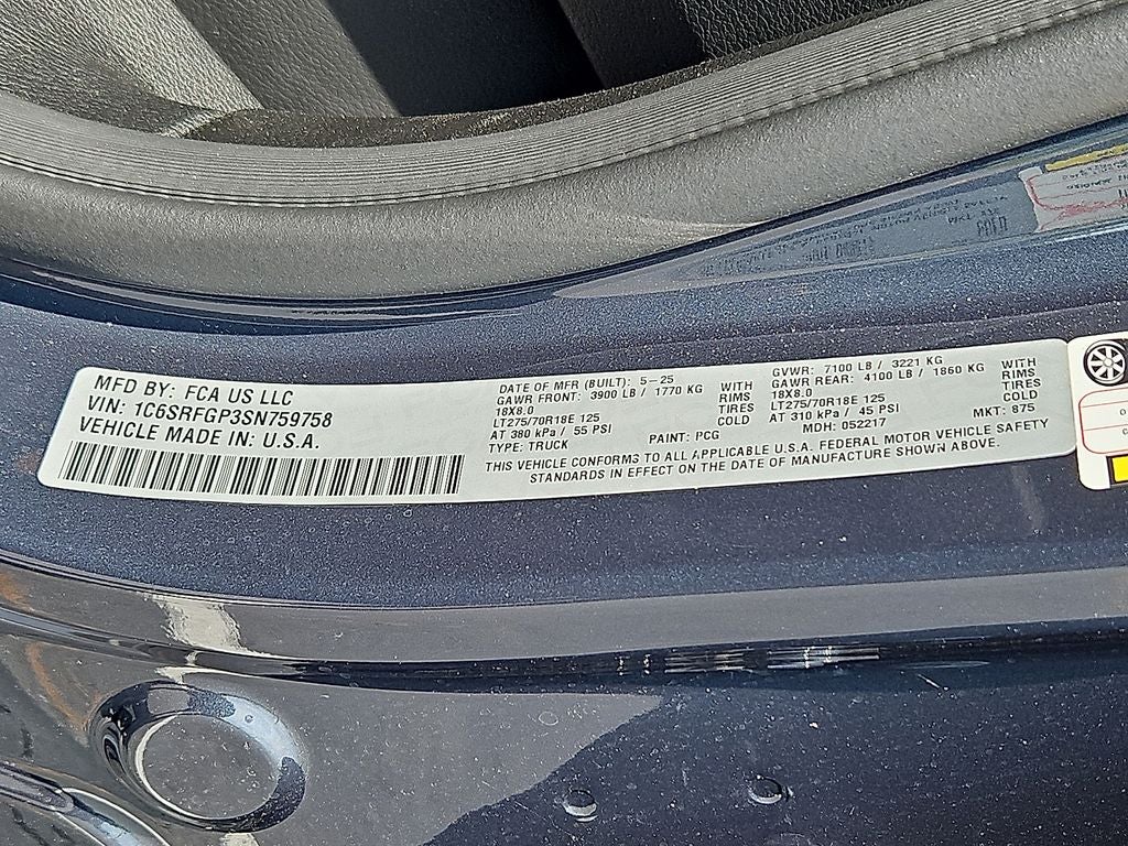 Trailer Tow Group: Exterior Mirrors with Supplemental Signals; Trailer Reverse Steering Control; Exterior Mirrors Courtesy Lamps; Manual Folding Exterior Mirrors; Trailer Tire Pressure Monitoring System; Trailer Tow Mirrors; Exterior Mirrors with Heating Element; Trailer Brake Control; Accent Color Tailgate Handle; Mirror Clearance/running Lights; Manuarl Telescoping Mirrors; Black Exterior Mirrors; Black Trailer Tow Power Mirrors; Power-Adjustable Convex Aux Mirrors. Quick Order Package 21B Warlock: Steering Gear Skid Plate; 18" X 8.0" Black Painted Aluminum Wheels; Raised Ride Height; Rear Performance Tuned Shock Absorbers; Front Performance Tuned Shock Absorbers; 115V Auxiliary Power Outlet; Cluster 7.0" TFT Color Display; Front LED Fog Lamps; Full Size Spare Tire; Tow Hooks; LT275/70R18E OWL AT Tires; Dual Exhaust with Black Tips; E-Locker Rear Axle; Warlock Decal; Fuel Tank Skid Plate; MOPAR Front and Rear Rubber Floor Mats; Selec-Speed Control. Tradesman Level 1 Equipment Group: SiriusXM Satellite Radio; Rear Power Sliding Window; 2nd Row in Floor Storage Bins; Cloth Bench Seat; Front and Rear Floor Mats. MOPAR Black Tubular Side Steps. 33 Gallon Fuel Tank. Trailer Brake Control. Forged Blue Metallic. 3.92 Rear Axle Ratio. **Equipment listed is based on original vehicle build and subject to change. Please confirm the accuracy of the included equipment by calling the dealer prior to purchase.**