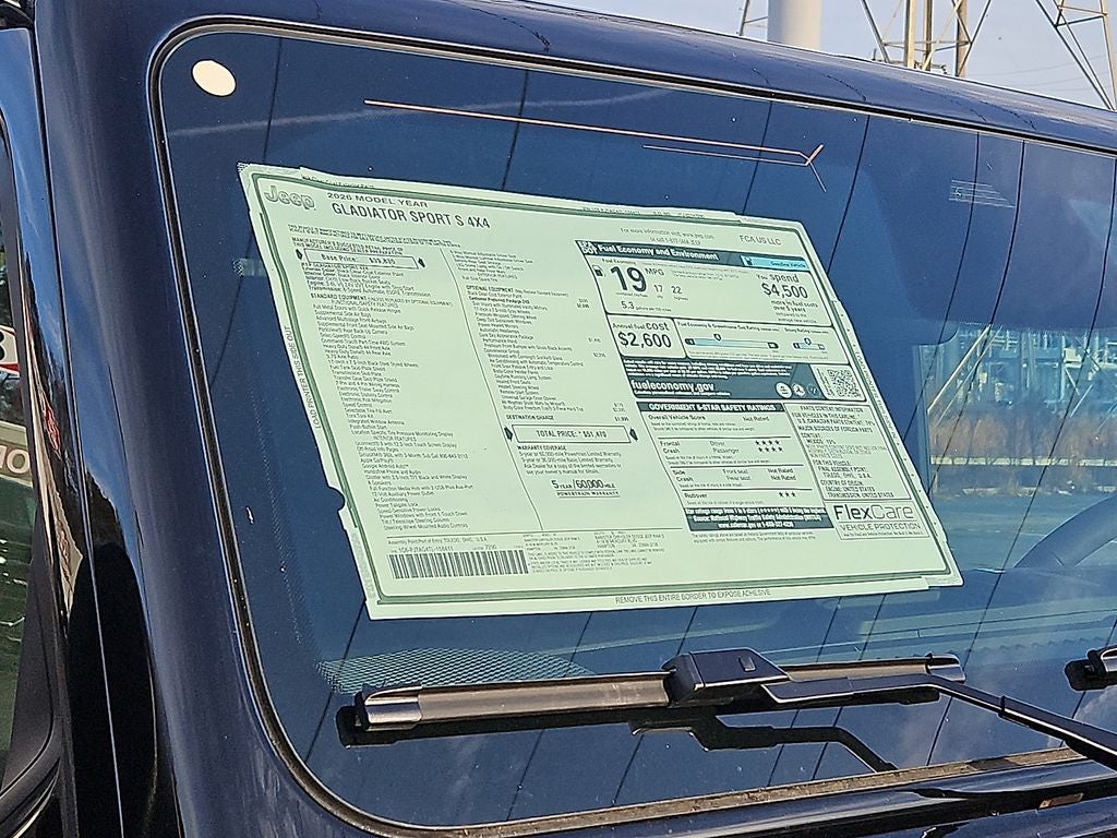 Keep your hands warm all winter with a heated steering wheel in this model . Bluetooth® technology is built into the Jeep Gladiator, keeping your hands on the steering wheel and your focus on the road. An off-road package is installed on this 2026 Jeep Gladiator so you are ready for your four-wheeling best. See what's behind you with the back up camera on this vehicle. The vehicle's Forward Collision Warning feature alerts drivers to potential front-end collisions. This Jeep Gladiator keeps you comfortable with Auto Climate. Apple CarPlay: Seamless smartphone integration for this model - stay connected and entertained on the go! This 1/2 ton pickup comes equipped with Android Auto for seamless smartphone integration on the road. Start this 2026 Jeep Gladiator from inside with remote start. The Jeep Gladiator has an elegant black exterior finish. The Jeep Gladiator has four wheel drive capabilities. The Jeep Gladiator has a V6, 3.6L high output engine.
