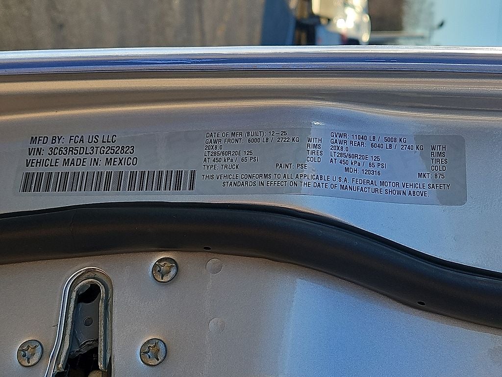 Quick Order Package 24Z Big Horn. Night Edition: Firestone Brand Tires; Gloss Black Nostrils/mic Black Grille; LT285/60R20E OWL On/off Road Tires; Black Exterior Truck Badging; 20" X 8.0" Black Painted Aluminum Wheels; Body Color Grille-Surround; Black Interior Accents; Black Wheel Center Hub; Painted Front Bumper; Painted Rear Bumper. Big Horn Level 1 Plus Equipment Group: Google Android Auto; SiriusXM Radio Service; For Details. Visit DriveUconnect.com; For More Info. Call 800-643-2112; Integrated Voice Command with Bluetooth®; Emergency Vehicle Alert System (EVAS); 12" Touchscreen Display; Glove Box Lamp; Auto Power-Folding Mirrors; Footwell Courtesy Lamp; Anti-Spin Differential Rear Axle; Mirror Running Lights; MOPAR Deployable Bed Step; Alexa Built-In; Apple CarPlay; Power-Adjustable Convex Aux Mirrors; Forward and Reverse Utility Lights; Locking Lower Glove Box; Remote Start System; 9 Alpine Speakers with Subwoofer; Disassociated Touchscreen Display; Dual Glove Boxes; 2nd Row in Floor Storage Bins; Rear View Auto Dim Mirror; Rear Dome with On/off Switch Lamp; LED Bed Lighting; Connectivity - US/Canada; GPS Navigation; 4G LTE Wi-Fi Hot Spot; GPS Antenna Input; Exterior Mirrors with Heating Element; SiriusXM with 360L; Global Telematics Box Module; Connected Travel and Traffic Services; Foam Bottle Insert (door Trim Panel); Black Exterior Mirrors; Big Horn Instrument Panel Badge; Off-Road Info Pages; Selectable Tire Fill Alert; Trailer Tow Pages; HD Radio; Uconnect 5 Navigation with 12.0" Display Radio; Power Heated Folding Telescopic Mirrors; Exterior Mirrors with Supplemental Signals; Steering Wheel Mounted Audio Controls; Exterior Mirrors Courtesy Lamps; Air Conditioning ATC with Dual Zone Control; MOPAR Spray in Bedliner; Power Adjust Mirrors; Luxury Steering Wheel; Power Telescoping Mirrors. Quick Order Package 2UZ Big Horn. 5th Wheel/gooseneck Towing Prep Group. Anti-Spin Differential Rear Axle. Premium Cloth Bucket Seats. Remote Start System. Silver Zynith. Instrument Panel Mounted Auxiliary Switches. Rear Wheelhouse Liners. Clearance Lamps. Power 2-Way Driver Lumbar Adjust. **Equipment listed is based on original vehicle build and subject to change. Please confirm the accuracy of the included equipment by calling the dealer prior to purchase.**